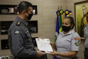 Os policiais receberam o elogio ao lado de familiares, do comandante da 21ª Cia Centro, tenente-coronel Corrêa Júnior, e de outros oficiais do Comando Geral da PMMT.