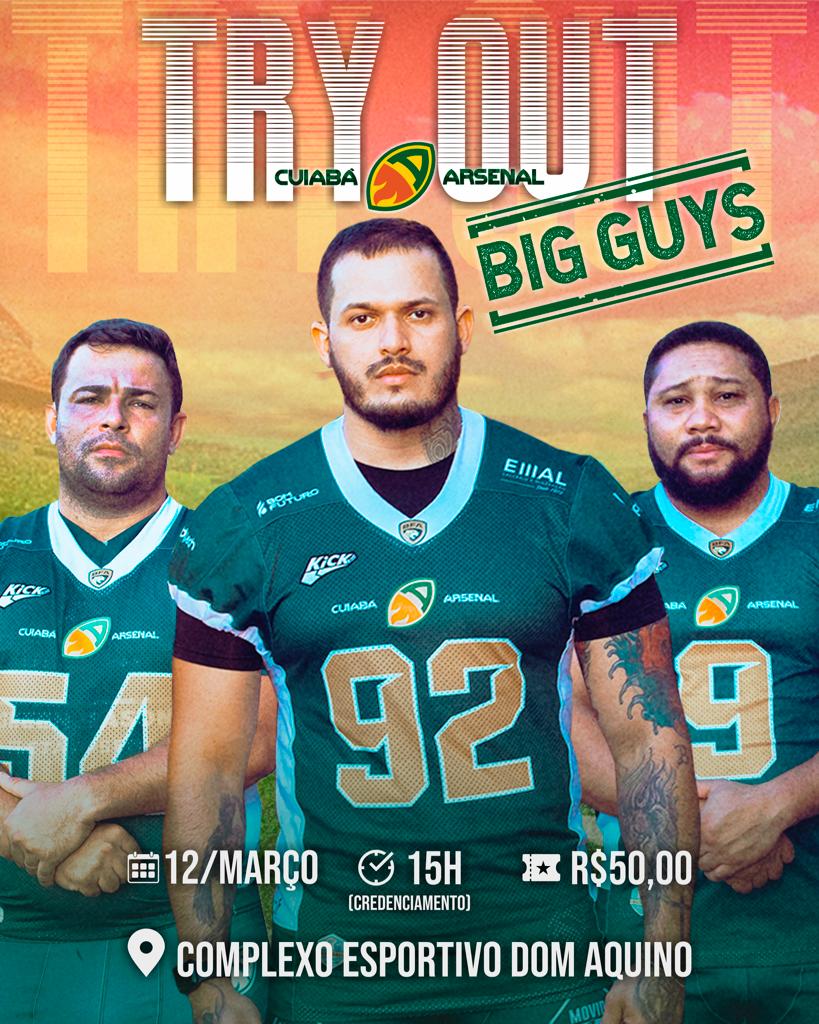 Inscrição: Pelo link do Sympla – https://www.sympla.com.br/evento/try-out-cuiaba-arsenal-big-guys/1893352?share_id=0 . Custo de R$ 50,00.