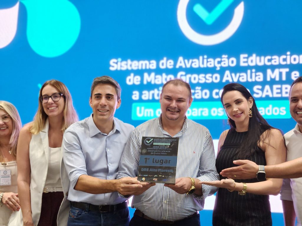 Na ocasião, a Seduc homenageou com entrega de placas de reconhecimento às cinco Diretorias Regionais de Educação (DREs) que alcançaram os melhores resultados no SAEB 2023, são elas: DRE Alta Floresta (1ª), DRE Sinop (2ª), DRE Matupá (3ª), DRE Tangará da Serra (4ª) e DRE Diamantino (5ª).
