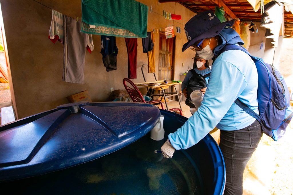 A foto ilustrada é a de um agente de saúde vestido com camisa azul clara inspecionando uma caixa d” água de tampa azul numa ação de combate ao mosquito da dengue.