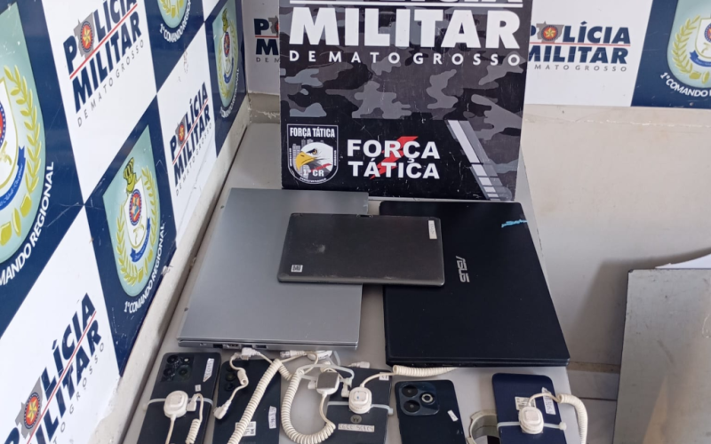 Policiais militares da Força Tática do 1º Comando Regional prenderam um homem de 25 anos, suspeito de roubo, nesta terça-feira (23.7), em Cuiabá. Com o suspeito, foram recuperados um tablet, dois notebooks e cinco celulares.