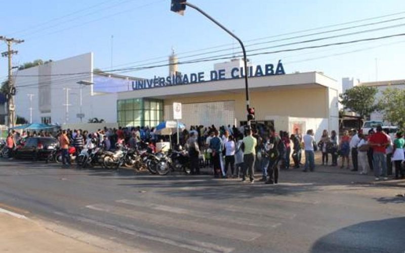 A foto mostra a fachada da Universidade de Cuiabá, local do evento, com o público em busca de uma vaga de emprego na Feira de Empregabilidade realizada no ano passado.