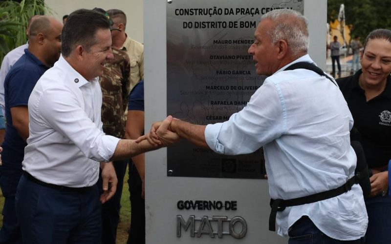 O governador Mauro Mendes e a primeira-dama Virginia Mendes inauguraram, nesta sexta-feira (05.12), a nova praça do Distrito de Bom Jardim, em Nobres, e lançaram uma série de obras que vão impulsionar o turismo na região, proporcionando oportunidades de melhoria de vida para a população.