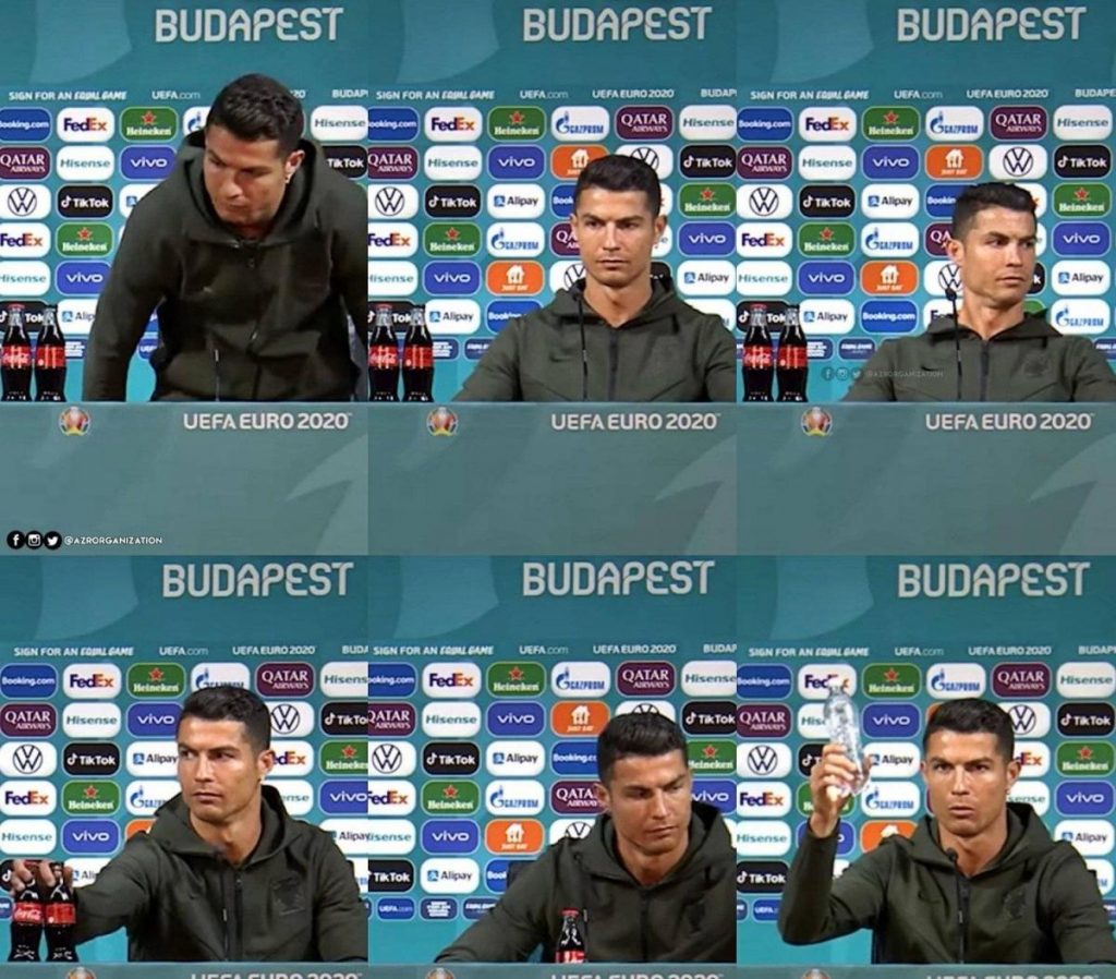 Ceferin ficou desesperado quando Cristiano Ronaldo tirou duas garrafas de Coca-Cola, que estavam na sua frente, na coletiva de imprensa, antes da estreia de Portugal na competição, contra a Hungria. E colocou uma de água. Deixando claro que os refrigerantes fazem mal à saúde, na segunda-feira.