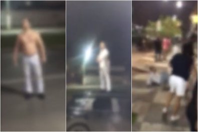 Em outro trecho do vídeo, o homem acaba sendo mobilizado pelo segurança. Ele é agarrado pelo pescoço, enquanto testemunhas acionam a Polícia Militar.