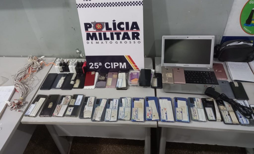 Em seguida, os militares encontraram diversos aparelhos celulares e cadernos com anotações, como contas bancárias, números e-mails, em cima de um rack. Diante da situação, os militares identificaram que os suspeitos utilizavam o imóvel para aplicar golpes, visto que não havia pertences pessoais da dupla no local.