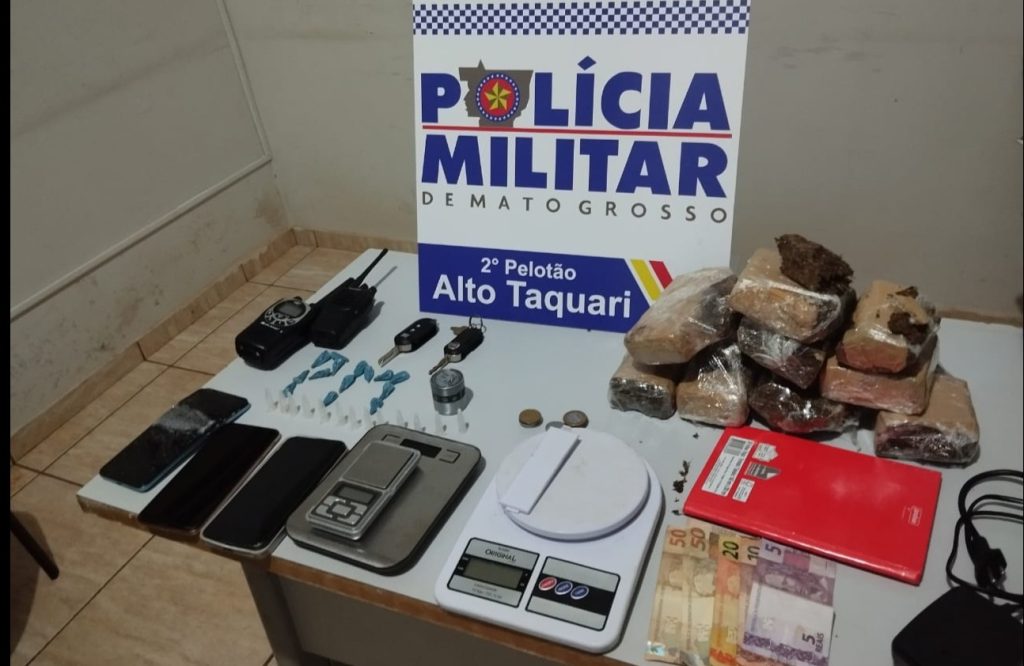 Ao realizarem vistoria no imóvel, os militares identificaram que haviam diversos entorpecentes espalhados entre os cômodos, dinheiro, balança de precisão e embalagens para venda dos produtos ilícitos. As equipes ainda flagraram um terceiro suspeito, que afirmou ter ido à casa jogar video-game.