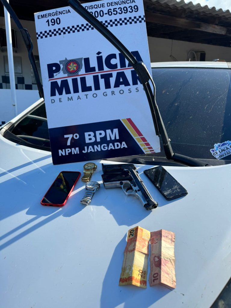 Dois homens, de 24 e 26 anos, foram presos nesta sexta-feira (03.05), suspeitos por porte ilegal de arma de fogo e roubo, na MT-246, no município de Rosário Oeste (104 km de Cuiabá). Com eles foram apreendidos uma pistola, um veículo HB 20, dois relógios e aparelhos celulares.