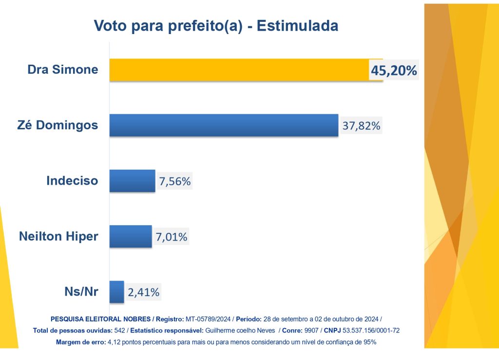 De acordo com pesquisa registrada na Justiça Eleitoral com número MT-05789/2024, Drªa Simone aparece em primeiro lugar nas intenções de voto no município com 45,20% da preferência dos eleitores. Os adversários aparecem com apenas 37,82% e 7,01%. A consulta foi realizada entre os dias 28.09 e 02.10.