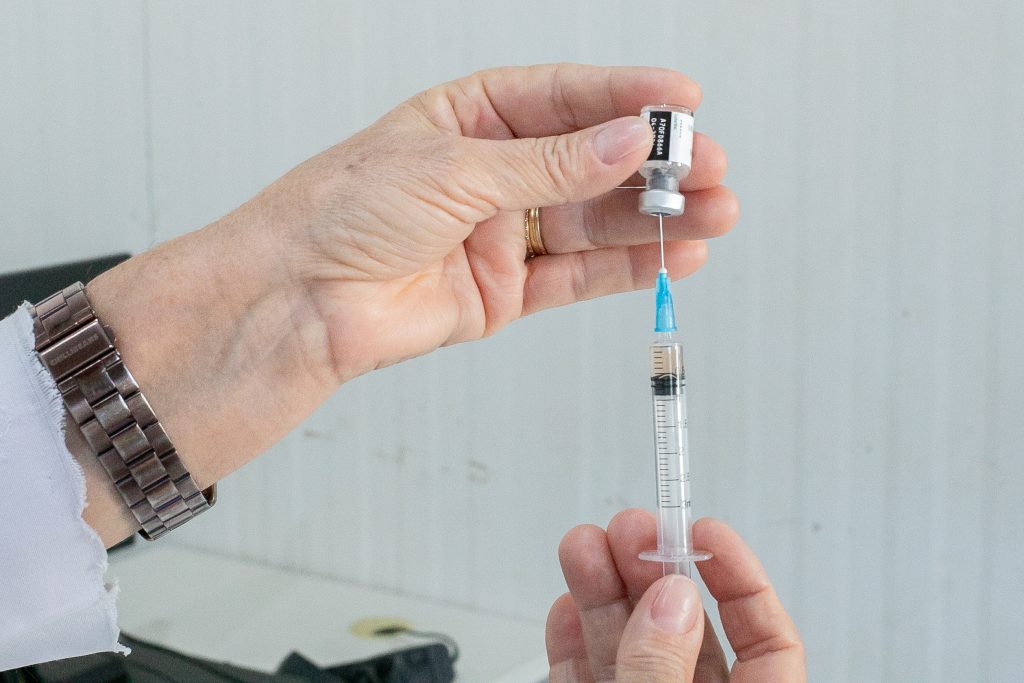 A imagem mostra as mãos de uma profissional de saúde preparando a vacina para ser aplicada.