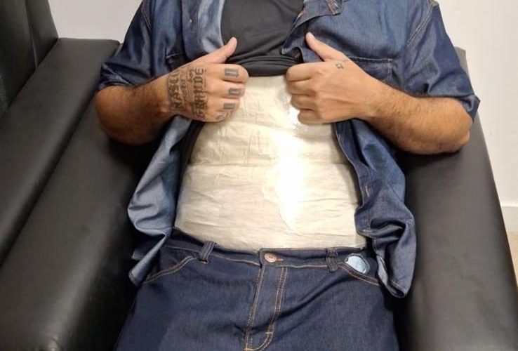 A Polícia Civil, em ação conjunta com a Polícia Federal, prendeu, na madrugada deste sábado (25.4), um homem, de 26 anos, no Aeroporto Marechal Rondon, localizado em Várzea Grande, tentando embarcar com drogas enroladas em seu corpo.